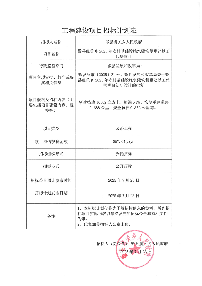 徽縣虞關(guān)鄉(xiāng)2025年農(nóng)村基礎(chǔ)設(shè)施水毀恢復(fù)重建以工代賑項目