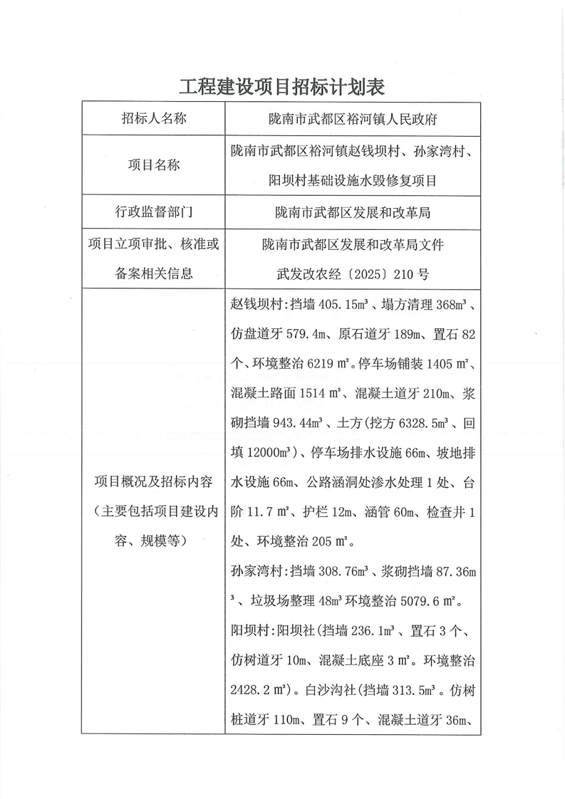 隴南市武都區(qū)裕河鎮(zhèn)趙錢壩村、孫家灣村、陽壩村基礎設施水毀修復項目