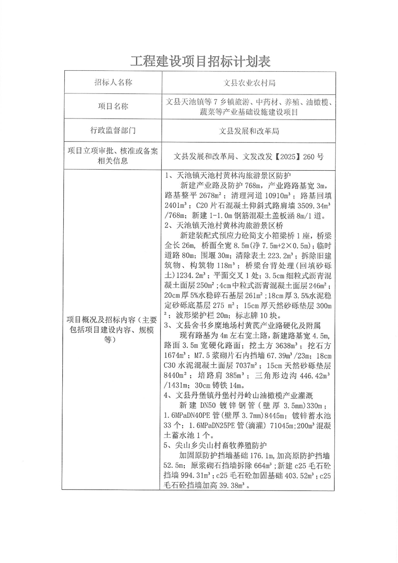 文縣天池鎮(zhèn)等7鄉(xiāng)鎮(zhèn)旅游、中藥材、養(yǎng)殖、油橄欖、蔬菜等產業(yè)基礎設施建設項目