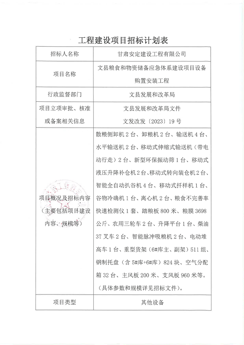 文縣糧食和物資儲(chǔ)備應(yīng)急體系建設(shè)項(xiàng)目設(shè)備購(gòu)置安裝工程