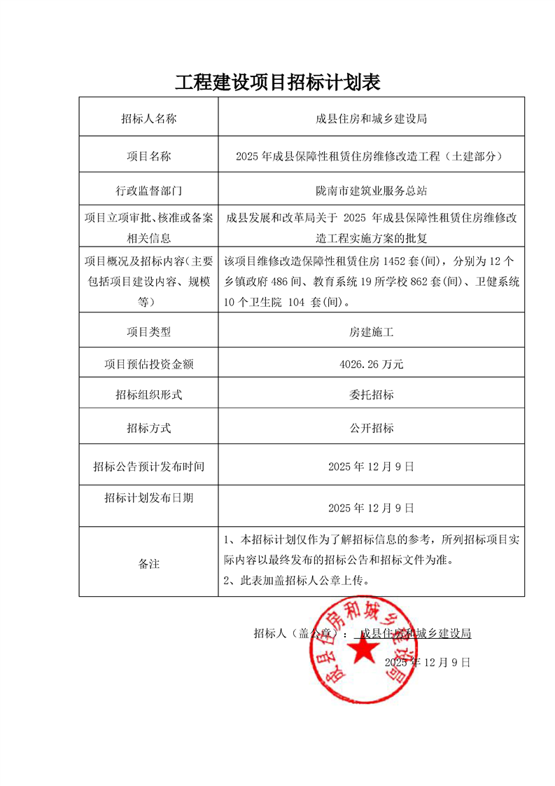 2025年成縣保障性租賃住房維修改造工程(土建部分)