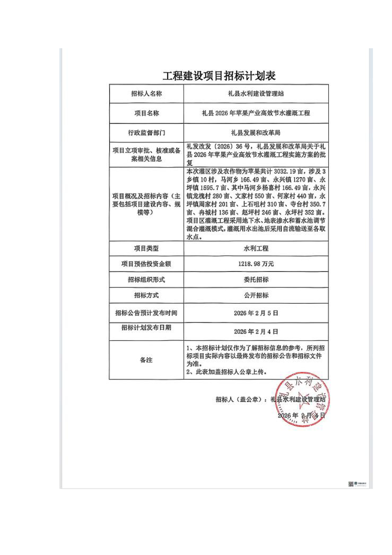 禮縣2026年蘋果產業(yè)高效節(jié)水灌溉工程
