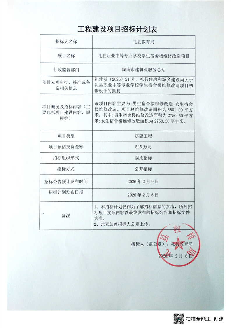 禮縣職業(yè)中等專業(yè)學校學生宿舍樓維修改造項目